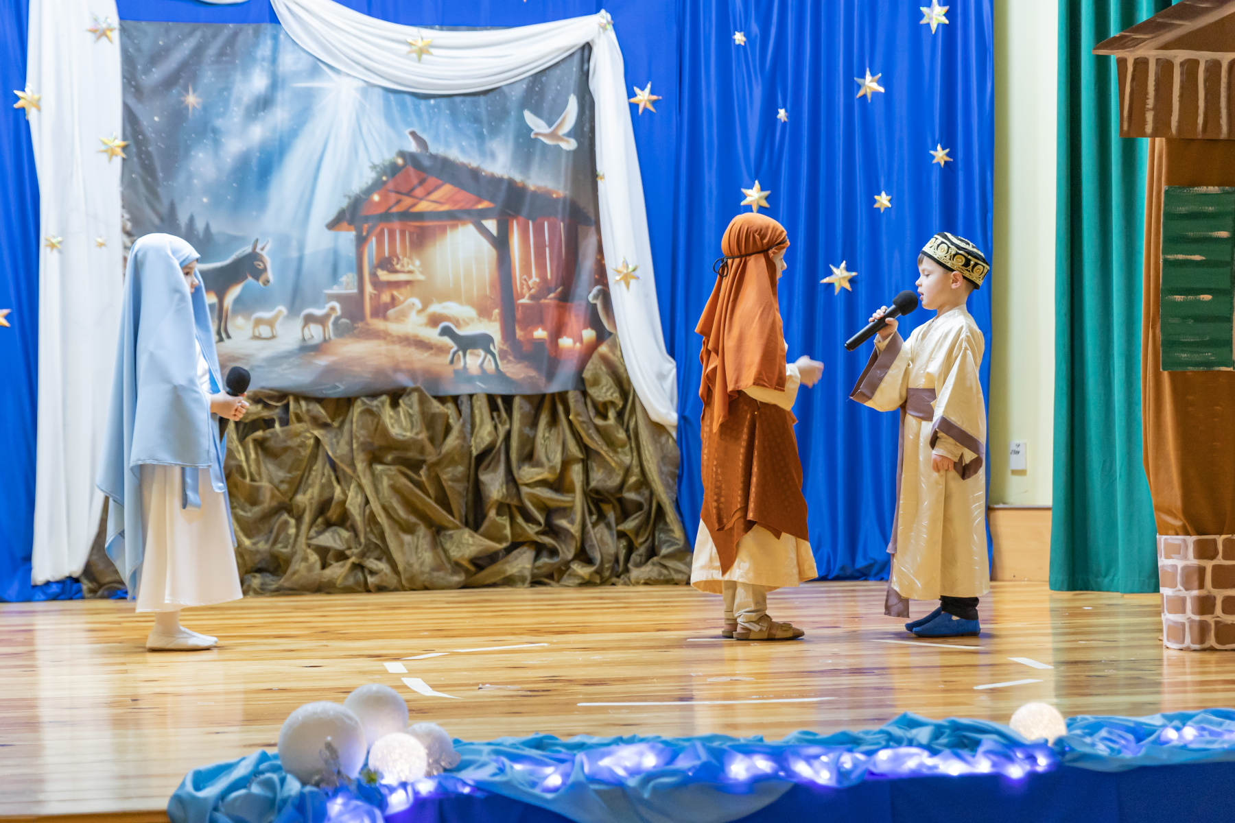 Na scenie zobaczyć można było opowiadające biblijną historię postaci Dzieciątka Jezus, Maryi czy Józefa, ale też grupy aniołków i pastuszków wykonujących barwne choreografie.