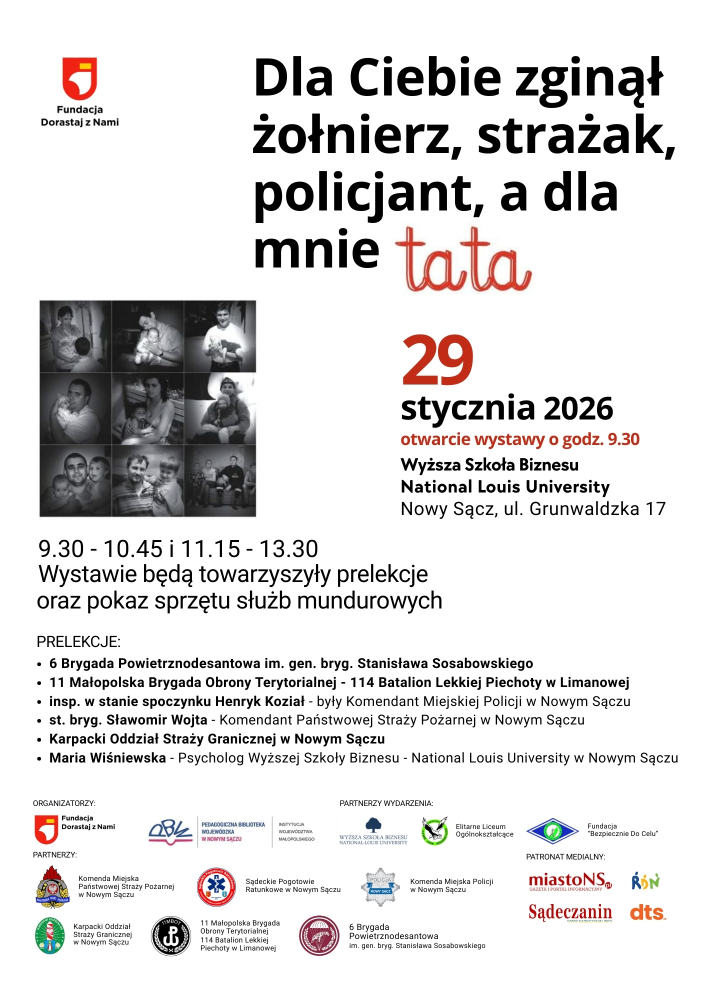 „Dla Ciebie zginął żołnierz, strażak, policjant, a dla mnie tata”. Wystawa Fundacji Dorastaj z Nami zostanie w czwartek (29 stycznia) oficjalnie otwarta w Wyższej Szkole Biznesu National Louis University w Nowym Sączu.