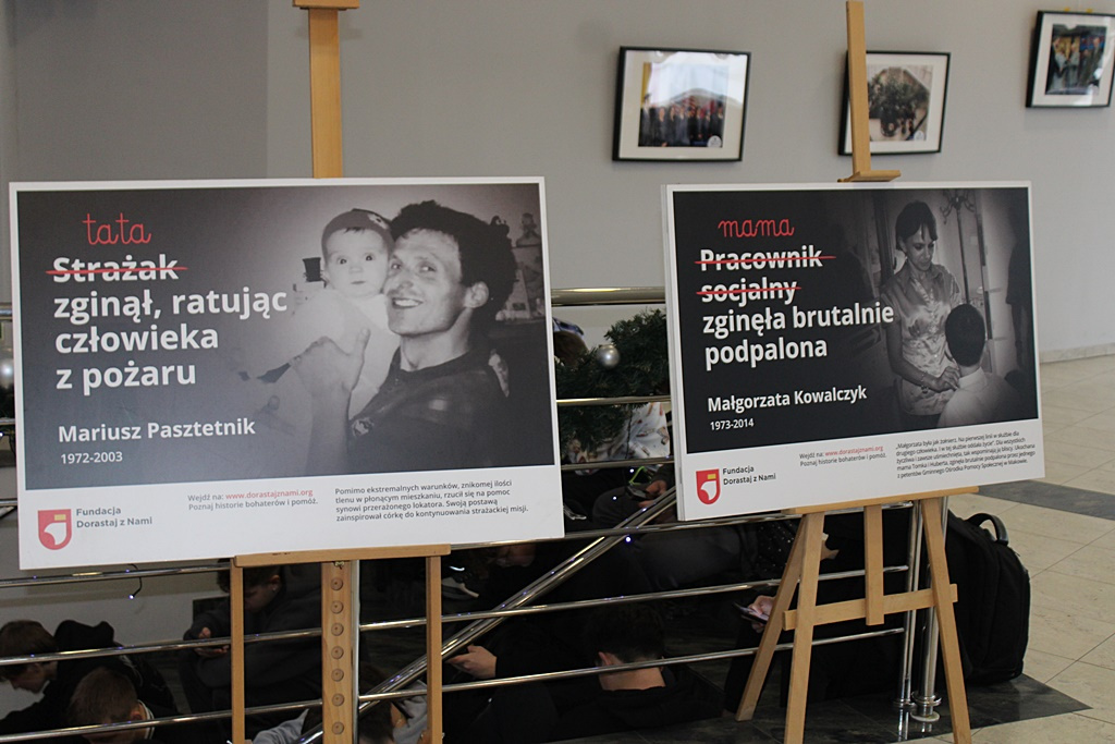 Korytarze uczelni zapełniły się zdjęciami ojców, żołnierzy, ratowników, strażaków, czy policjantów, którzy zginęli na służbie. Wraz z nimi na fotografiach są ich pociechy, dziś często już dorośli ludzie.