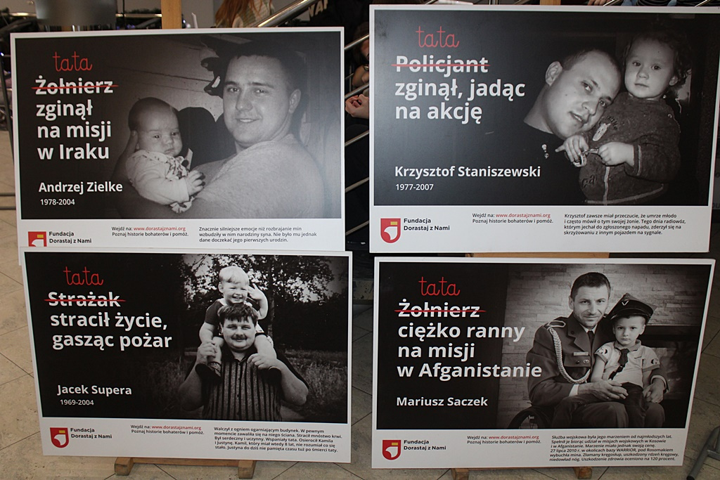 Korytarze uczelni zapełniły się zdjęciami ojców, żołnierzy, ratowników, strażaków, czy policjantów, którzy zginęli na służbie. Wraz z nimi na fotografiach są ich pociechy, dziś często już dorośli ludzie.