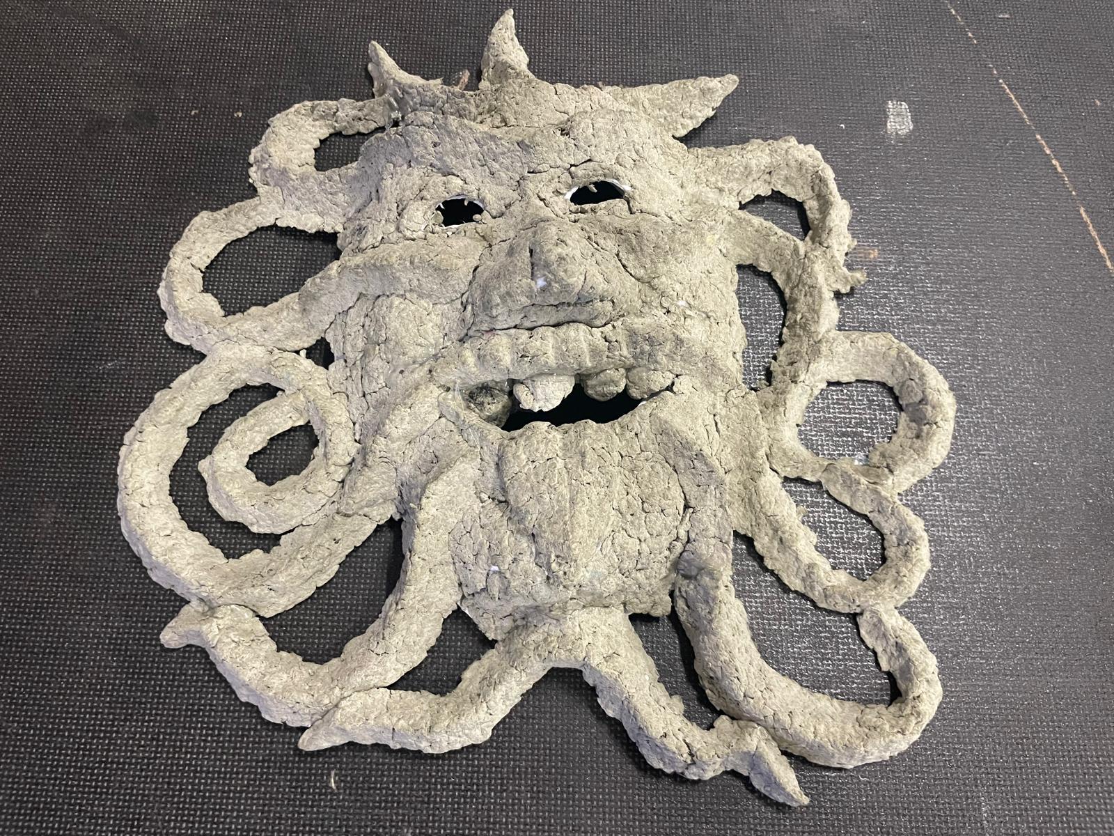 – Taka gotowa maska jest twarda, trzyma się mocno, jest stabilna, nie rozleci się. Można ją pomalować, gąbką moczoną w farbie o kolorze nieco jaśniejszym niż wyschnięta maska i należy rozjaśnić niektóre wypukłe elementy. To podkreśli przestrzenność tej maski, jej bryłę i wszystkie drobne elementy, będą bardziej widoczne i bardziej plastyczne.