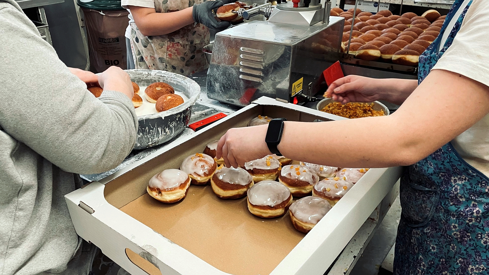 – Czas przygotowywania pączków wynosi od 2.5 – 3 godzin. Najpierw robimy rozczyn, czyli ciepłe mleko i drożdże, wszystko musi dobrze wyrosnąć. Później dodajemy następne składniki: jaja, żółtka, cukier, trochę soli, mąkę, a na koniec tłuszcz, czyli masło, trochę oleju i potem alkohol, żeby nie wchłaniały tłuszczu podczas smażenia. Dzisiaj zacząłem pracę o 3 rano. W tej chwili mamy zrobione ok. 6 tys. pączków. Na co dzień sprzedajmy ok. 300 pączków a w tłusty czwartek ok. 40 tys. Ludzie najczęściej wybierają klasyczne pączki z różą, lukrem i skórką pomarańczową. Klucz to, żeby wszystko dobrze wyrosło, odpowiednia temperatura wyrabiania ciasta i trzeba włożyć w to serce, wtedy wyjdą eleganckie pączki. Używamy świeżych drożdży, nie eksperymentujemy z drożdżami suchymi czy w płynie. Do smażenia zdecydowanie najlepszy jest smalec.