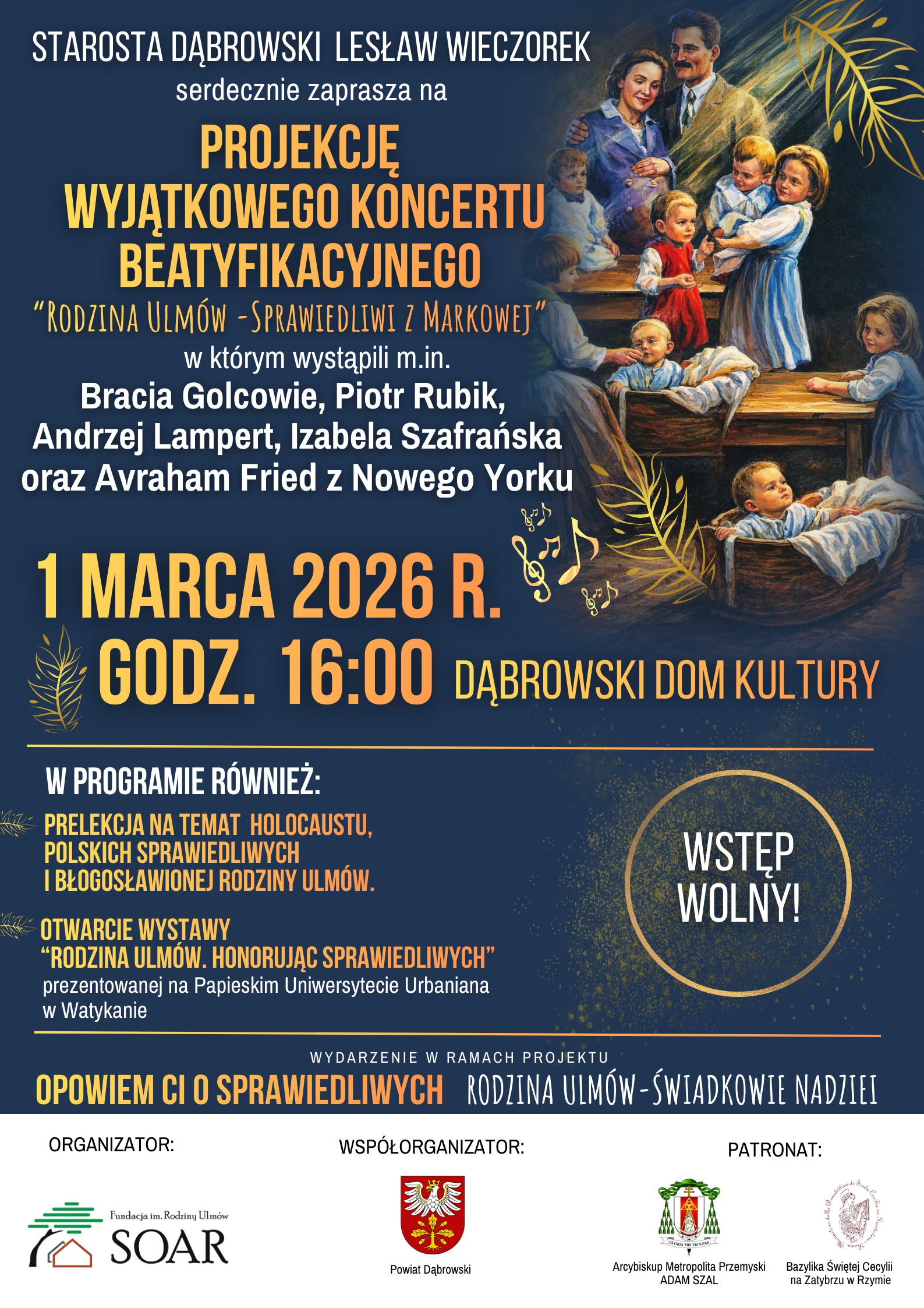 ‘Rodzina Ulmów – Sprawiedliwi z Markowej’ – pod takim hasłem odbędzie się wyjątkowy koncert beatyfikacyjny, poświęcony błogosławionej Rodzinie z Podkarpacia. W Dąbrowskim Domu Kultury usłyszymy wybitnych i cenionych artystów: Braci Golec, Piotra Rubika, Andrzeja Lamperta, Izabelę Szafrańską i światowej klasy muzyka z Nowego Jorku Avrahama Frieda.