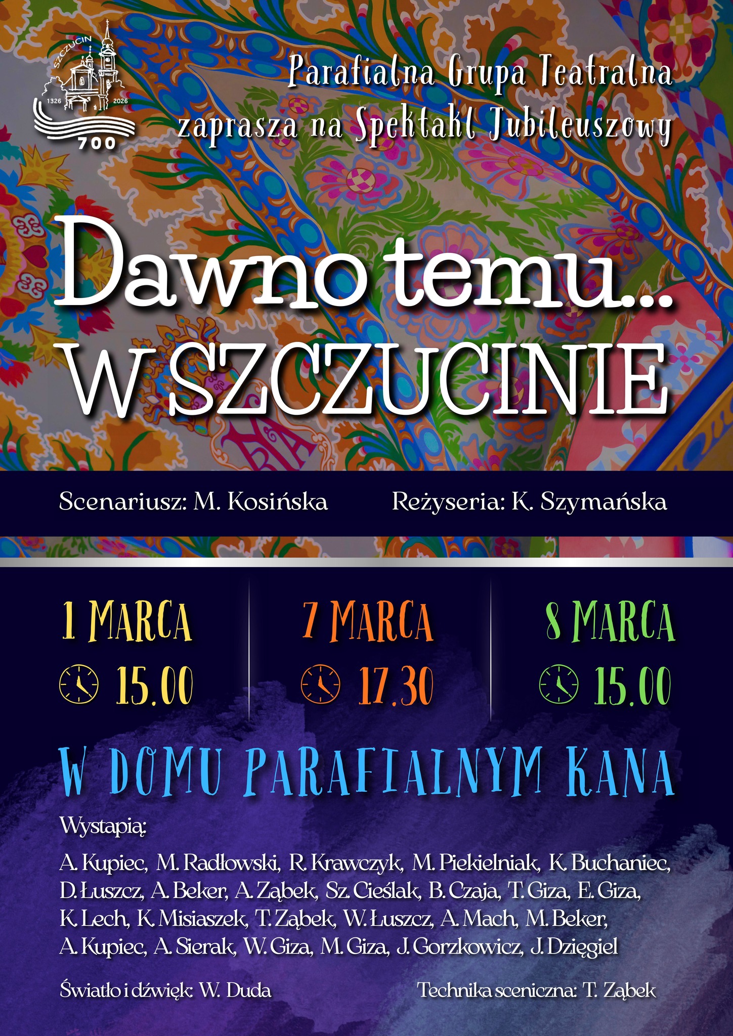 Parafialna Grupa Teatralna zaprasza na spektakl jubileuszowy pt. 'Dawno temu… w Szczucinie’. Wpisuje się on w jubileusz 700-lecia parafii w Szczucinie.