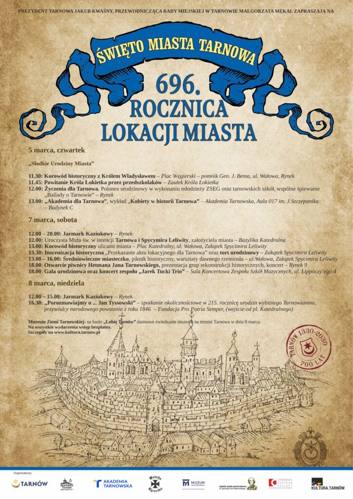 – W dwóch miejscach na ul. Wałowej, czyli na Placu Węgierskim część starsza i w Zaułku Króla Łokietka część młodsza. Tam się zbieramy i oczekujemy na ten orszak historyczny, który będzie szedł ulicą Wałową z Królem Władysławem Łokietkiem na koniu, bo to też nasza tarnowska tradycja, nie zabraknie chorągiewek i tym barwnym korowodem przejdziemy przez Plac Kazimierza Wielkiego na tarnowski rynek. Tam, oprócz rzeczy, które mamy tradycyjnie w scenariuszu, będzie też urodzinowy polonez –