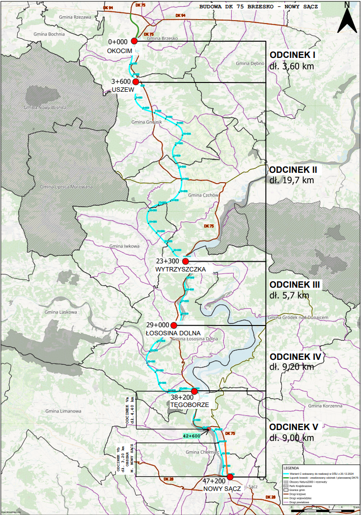 – Przetarg ma trzy części, dotyczące poszczególnych odcinków sądeczanki: pierwszego, początkowego, od obwodnicy Brzeska do Uszwi (o długości 3,6 km),   trzeciego, środkowego, od Wytrzyszczki do Łososiny Dolnej (5,7 km),  piątego, ostatniego, od Tęgoborza do Nowego Sącza (9 km). Koncepcja programowa uszczegółowi przebieg drogi w granicach wyznaczonych w decyzji środowiskowej dla wariantu C