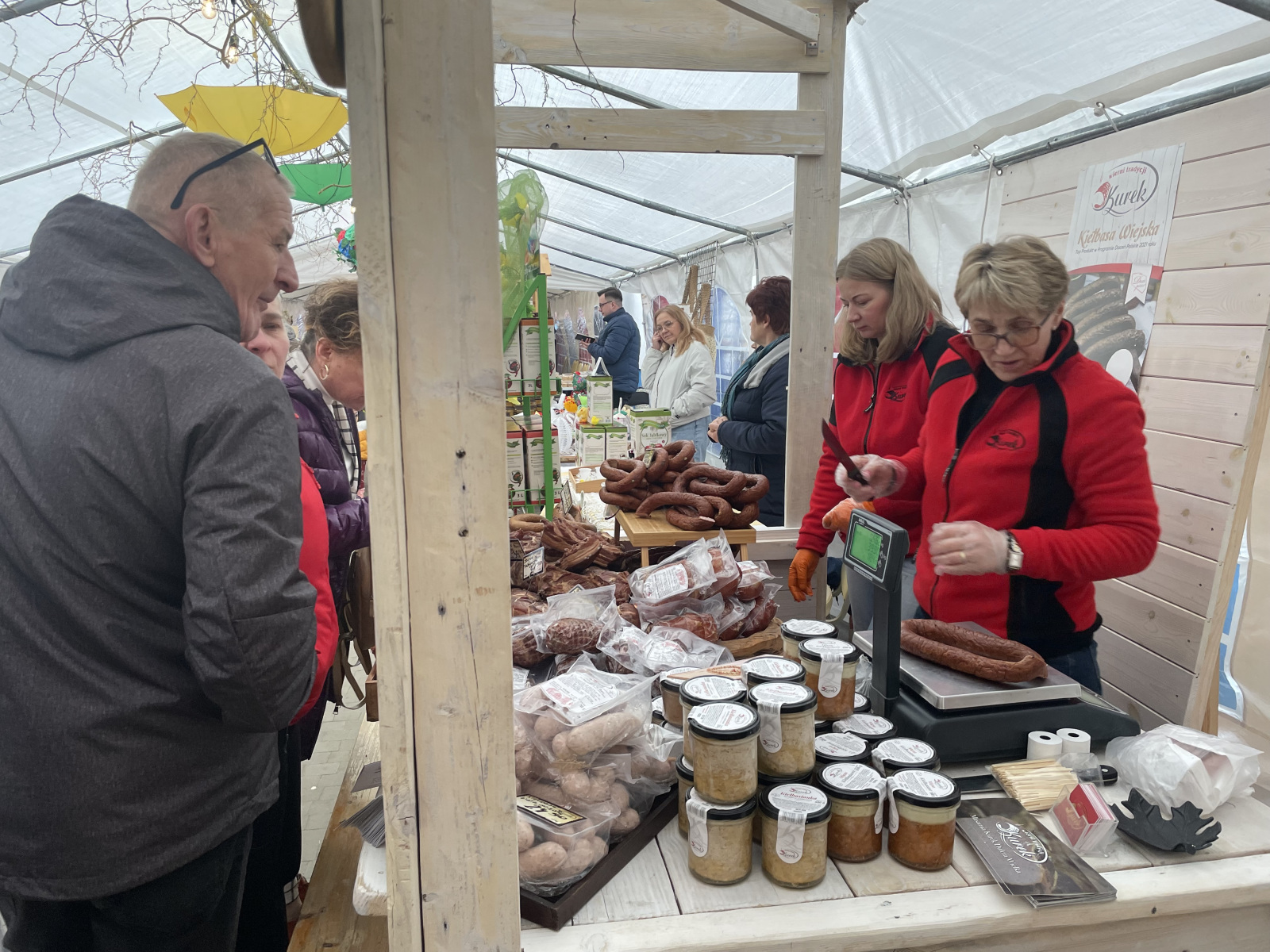 Dużym zainteresowaniem cieszyły się kolorowe pisanki i robione na szydełku kapturki na jajka w kształcie kurek czy pisklaków, które wylądują w koszyczku wielkanocnym. Bardzo długie kolejki ustawiały się także do wędlin. Odwiedzającym przygrywała Kapela Podwórkowa ‘Gulony’ z Zakliczyna.