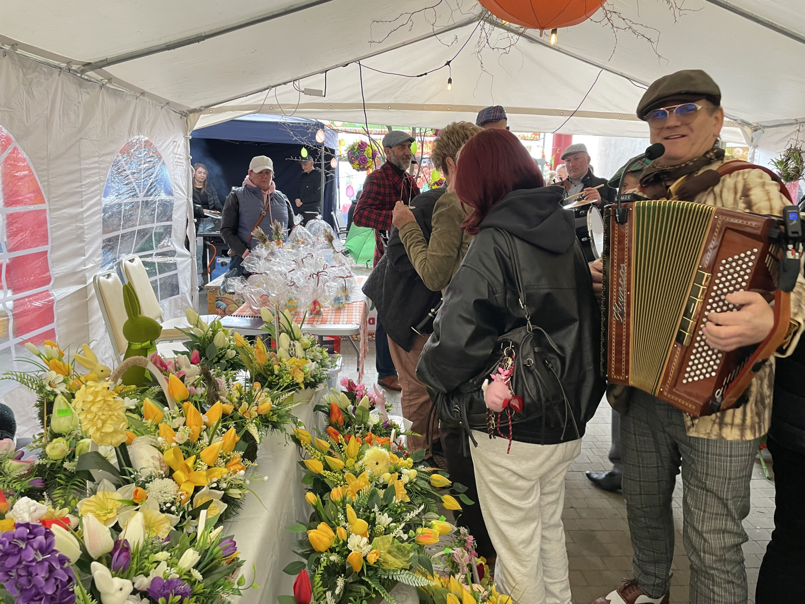 Dużym zainteresowaniem cieszyły się kolorowe pisanki i robione na szydełku kapturki na jajka w kształcie kurek czy pisklaków, które wylądują w koszyczku wielkanocnym. Bardzo długie kolejki ustawiały się także do wędlin. Odwiedzającym przygrywała Kapela Podwórkowa ‘Gulony’ z Zakliczyna.