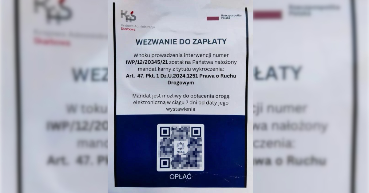 Jak ostrzegają służby, fałszywe zawiadomienia są umieszczane za wycieraczkami samochodów. Na pierwszy rzut oka mogą wyglądać wiarygodnie – zawierają logo KAS oraz kod QR, który ma prowadzić do szczegółów dotyczących mandatu. To jednak próba oszustwa.